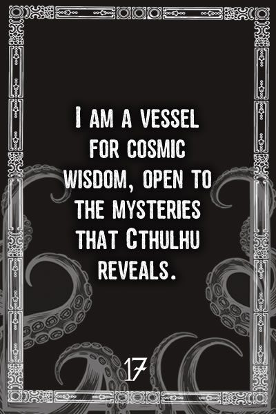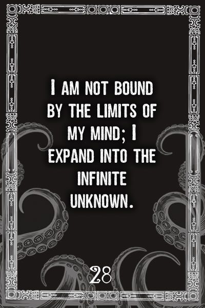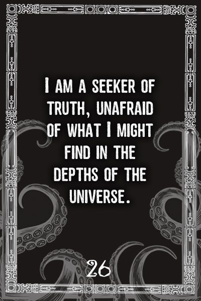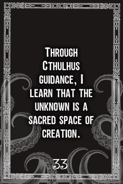 Below you will find the digital 50-card Cthulu Affirmation Deck filled with 33 ego-taming and fear-halting affirmations along with 17 potent symbol cards to enhance your experience. The interpretations are up to you.